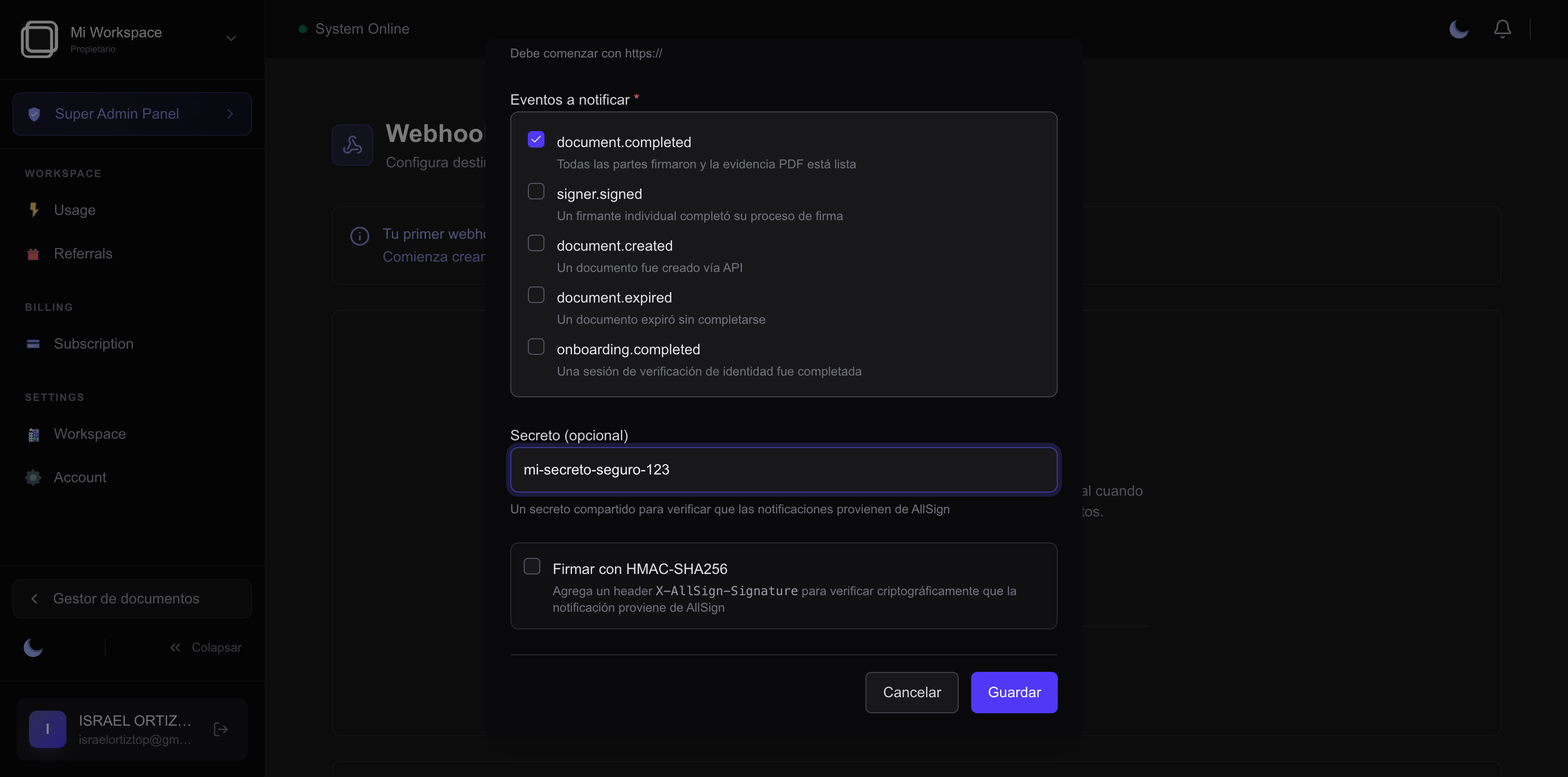 | Firmar con HMAC-SHA256 | (Requiere secreto) Agrega un header X-AllSign-Signature para verificación criptográfica |