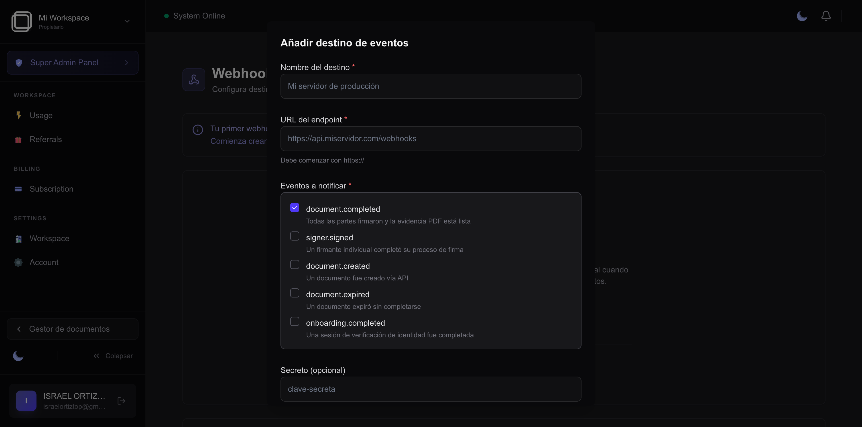 | Secreto | (Opcional) Una clave compartida para verificar que las notificaciones provienen de AllSign |